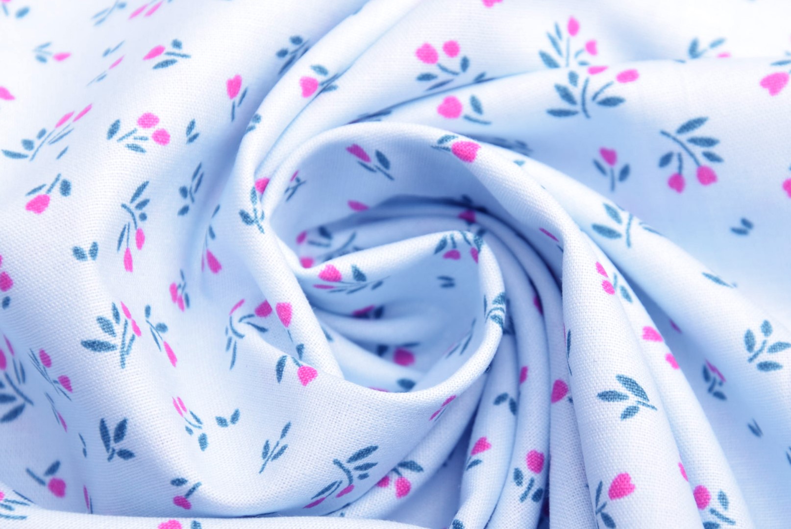 Popelín ve světle modré barvě s drobným potiskem sytě růžových květin s lístečky a stonky je příjemným materiálem v pevné plátnové vazbě, vhodným ke každodennímu použití, hladkým a pevným ve švu a tahu. Bavlnu lze využít na sukně, šaty, košile, dětské oblečení a dekorace do bytů a chat.