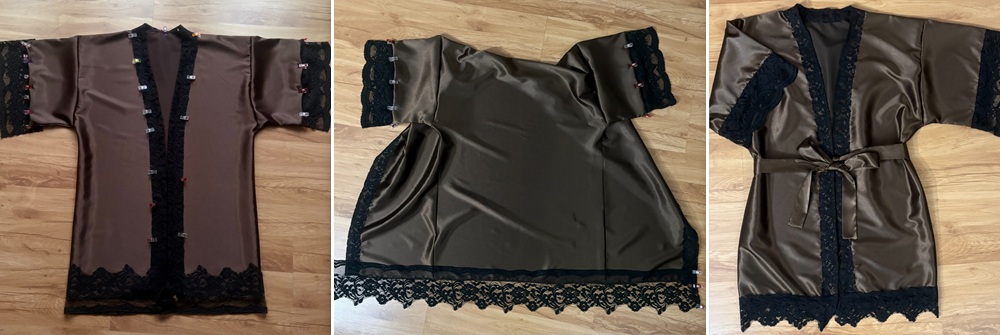 Spodní okraje rukávů i samotného župánku můžeme jednoduše začistit, zahnout do rubu a v kraji prošít. Pokud chceme župánku dodat jemnější a slavnostnější vzhled, můžeme na spodní okraje našít ozdobnou krajku.