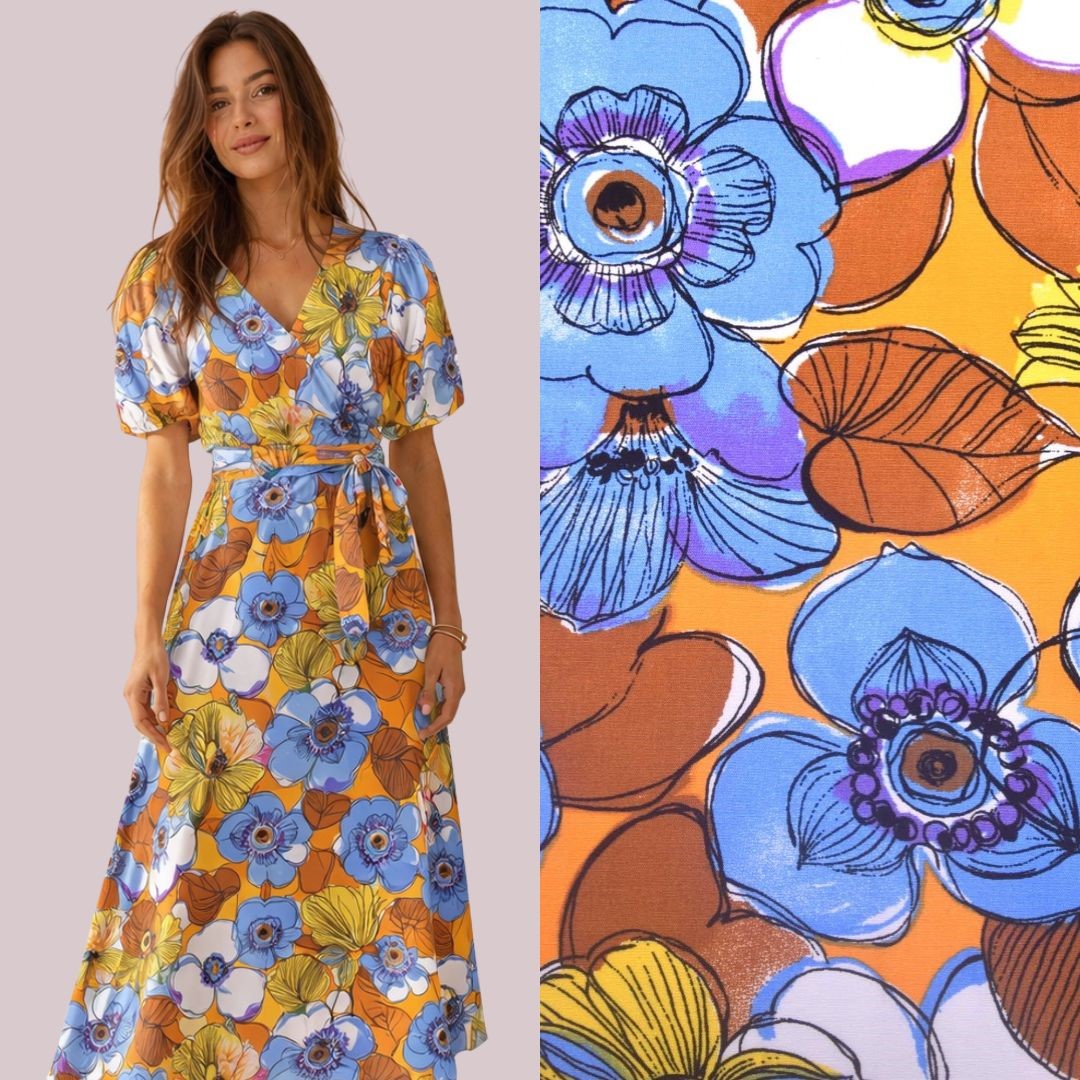 Viskózová látka v okrové barvě s potiskem malovaných květin v modré a žluté barvě. Viskózová látka je hladkým, splývavým materiálem, který je velice příjemný a chladivý na holé tělo. Látka je vhodná na letní sukně, šaty, tuniky, topy, volné a vzdušné košile.